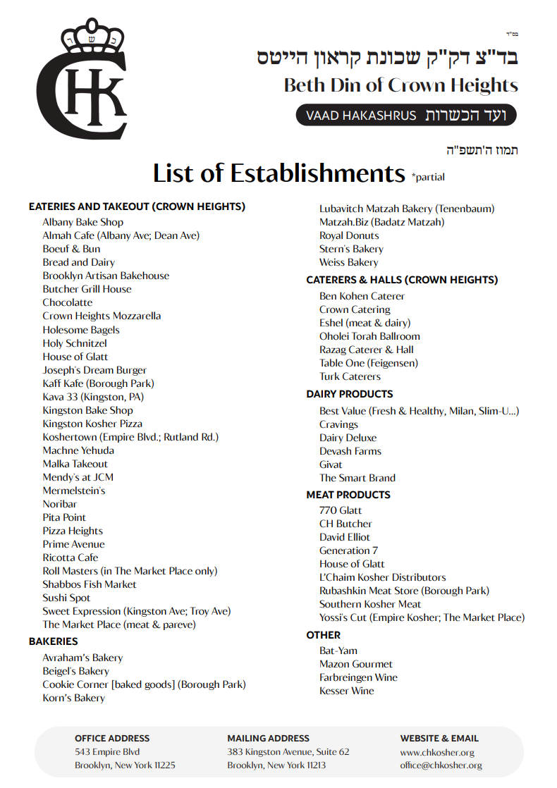 Over the past few weeks, the Crown Heights Vaad Hakashrus, in coordination with the Beis Din, compiled and updated the current list of local and external establishments operating under CHK kosher certification for the year 5785.